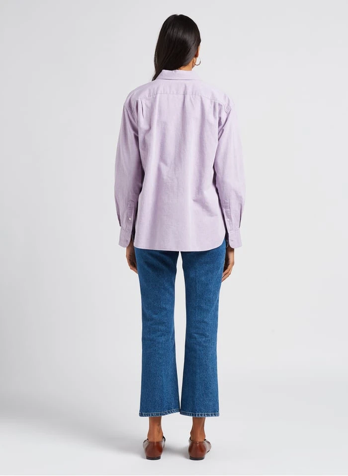 Ce modèle est présenté avec Chemise oversize en coton et lin by BELLEROSE, Tee-shirt col rond brodé La flemme en coton bio by MAISON LABICHE, Jean flare en coton by SOEUR