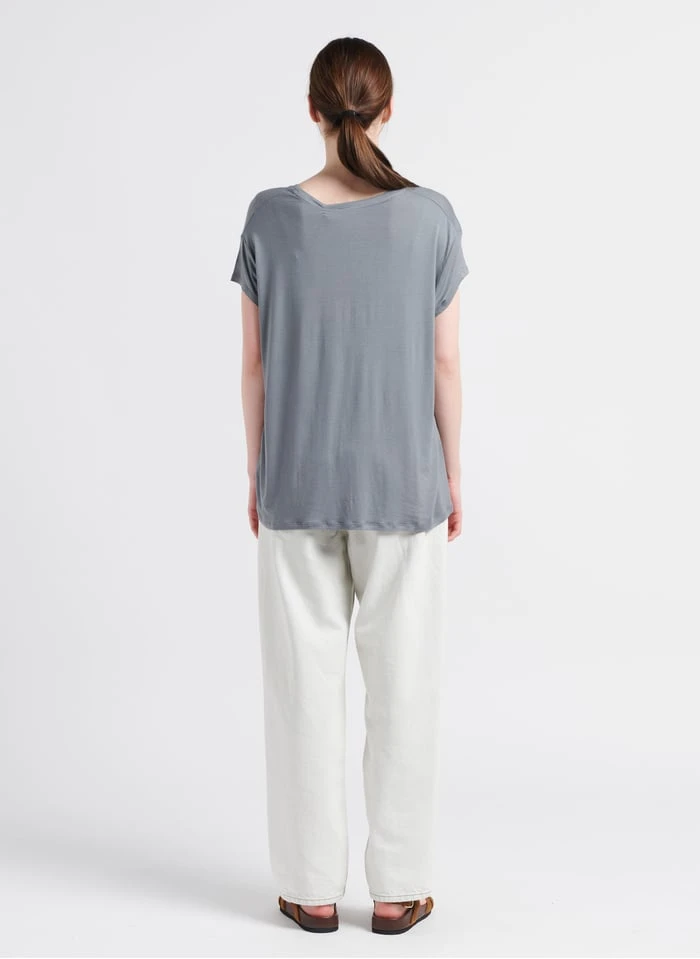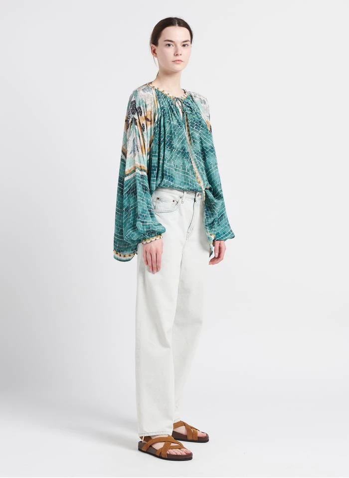 Ce modèle est présenté avec Top col tunisien en coton mélangé by MES DEMOISELLES, Jean droit en coton délavé by AMERICAN VINTAGE